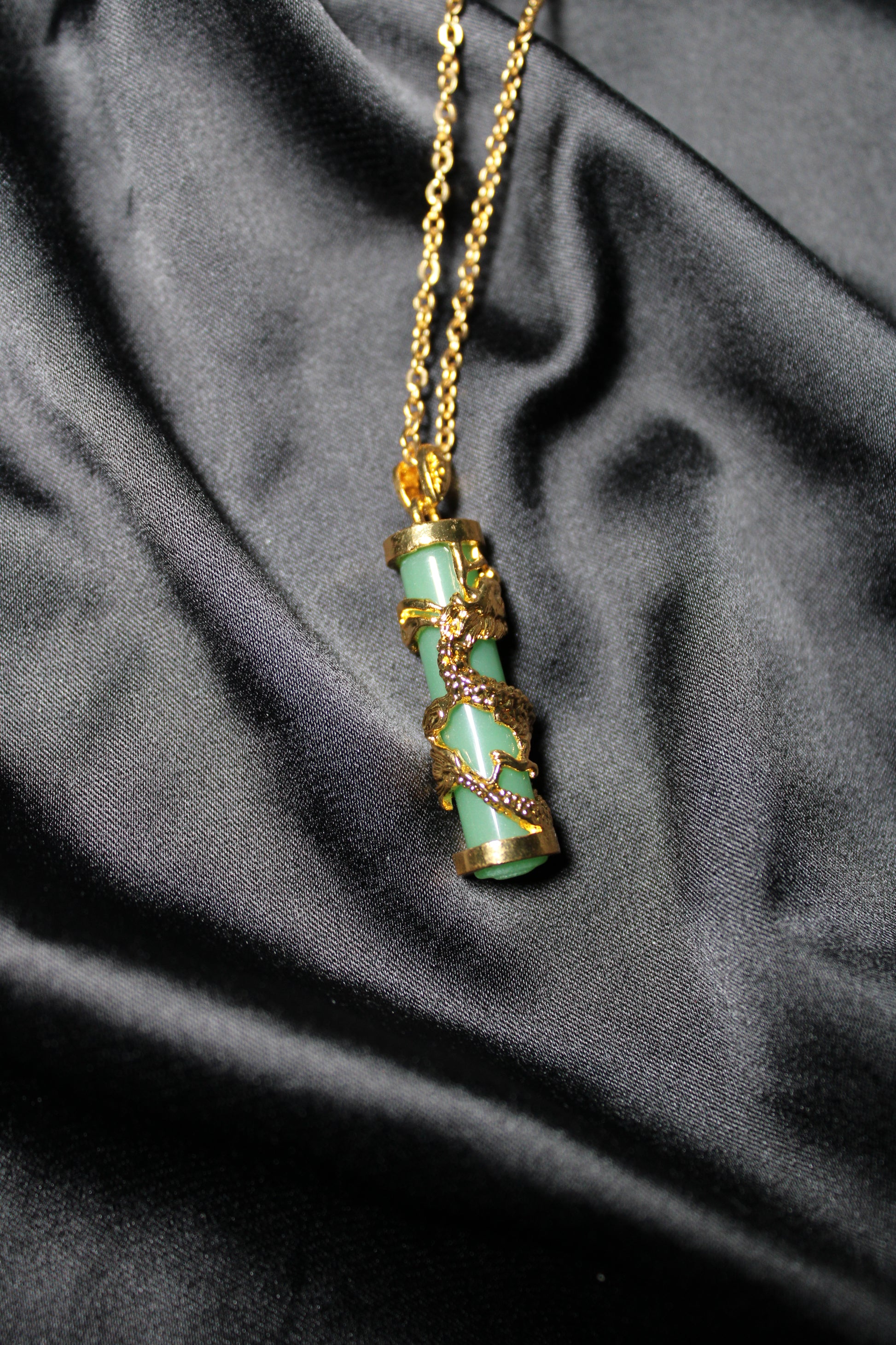The Dragon Jade Column Necklace is made of stainless steel. 18k gold plated and 18” long.