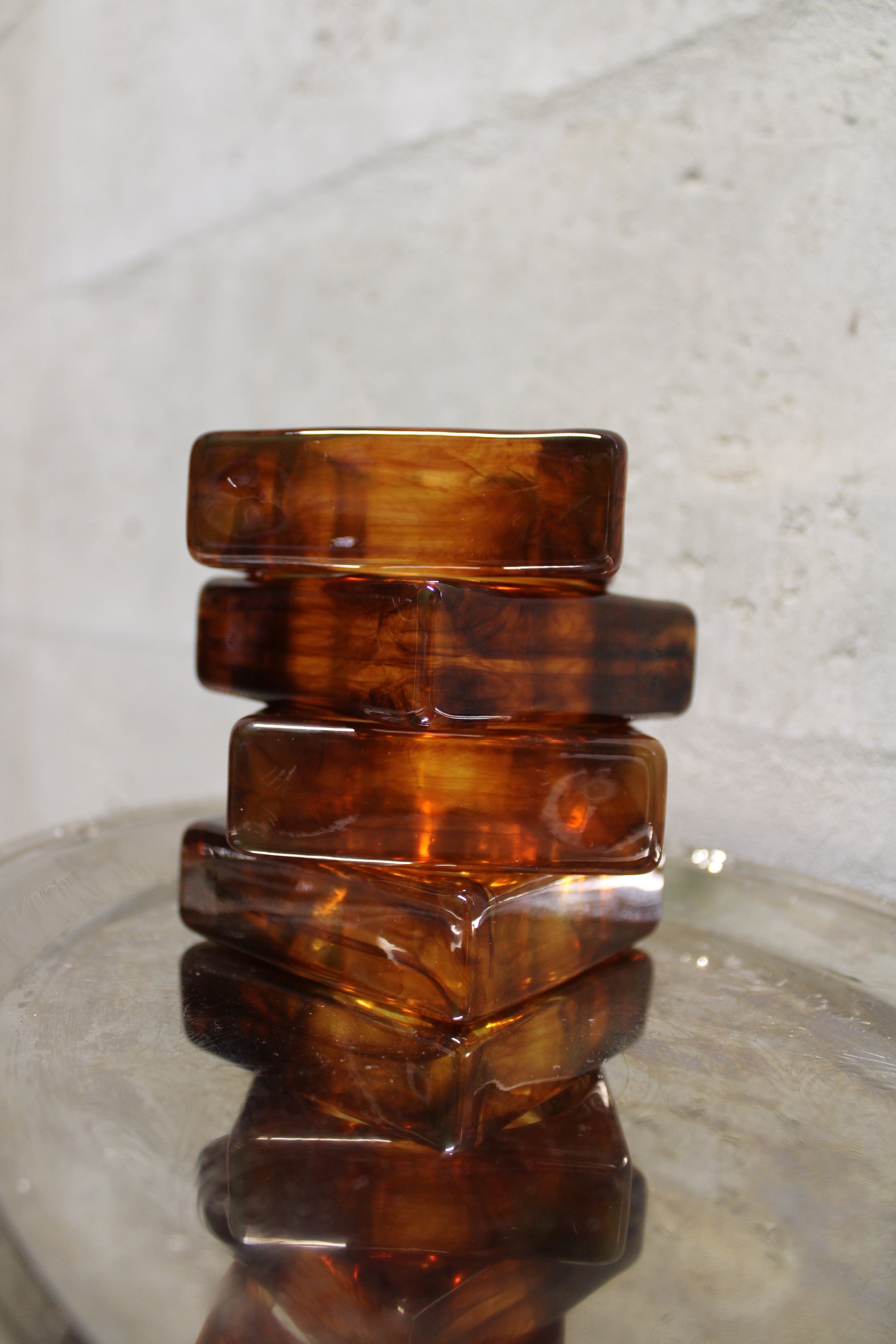 Warm brown bangles with a clean, square shape. They have a slightly see through finish that catches the light, giving them a soft glow and a little depth when you wear them. Easy to stack or wear on their own, they add a grounded, warm touch to any look while still feeling simple and effortless.