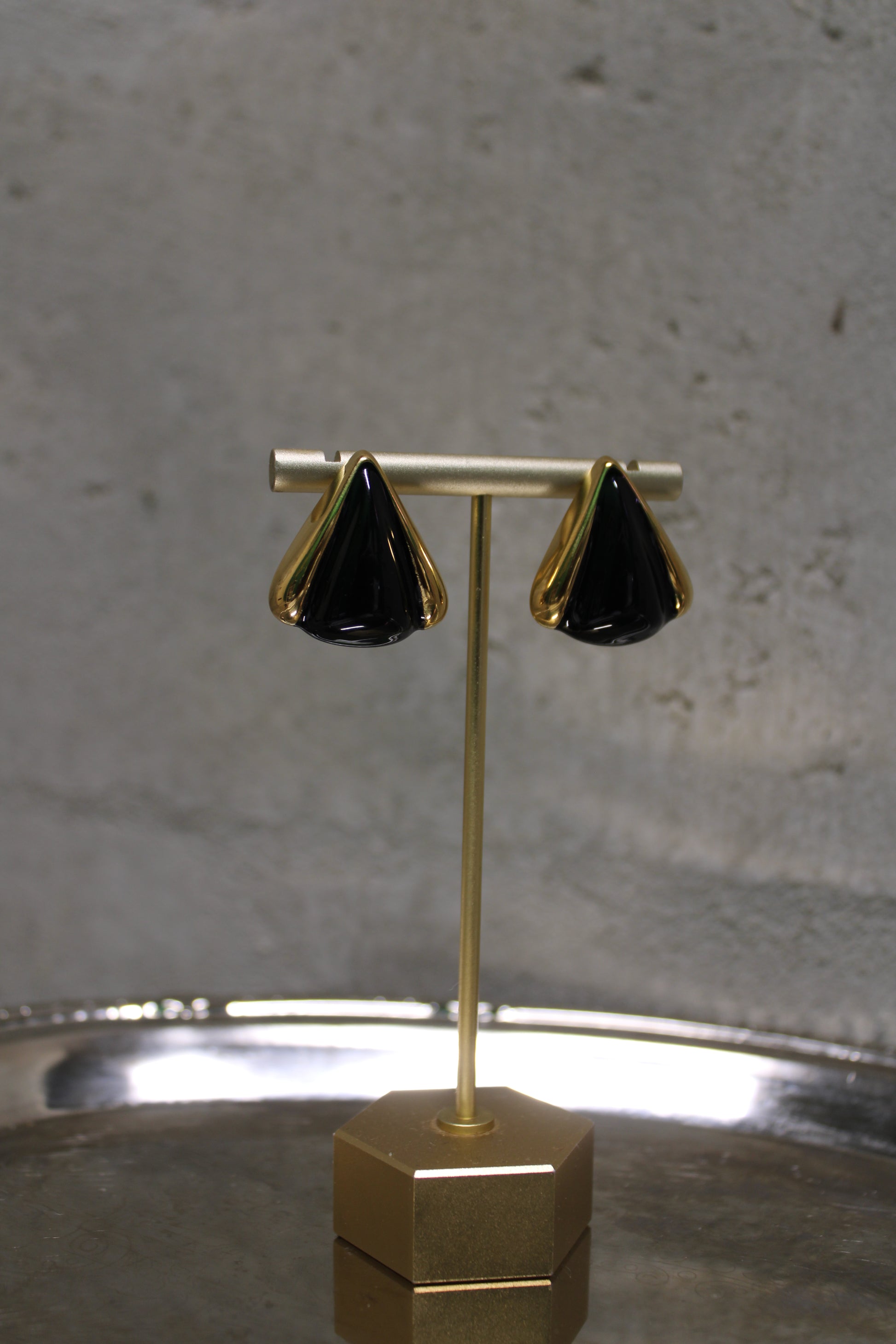 The Zuri earrings feature sleek black triangular forms framed in gold, creating a silhouette that is both bold and refined. They bring a subtle edge to any look, from sunlit afternoons to warm, late evenings.
